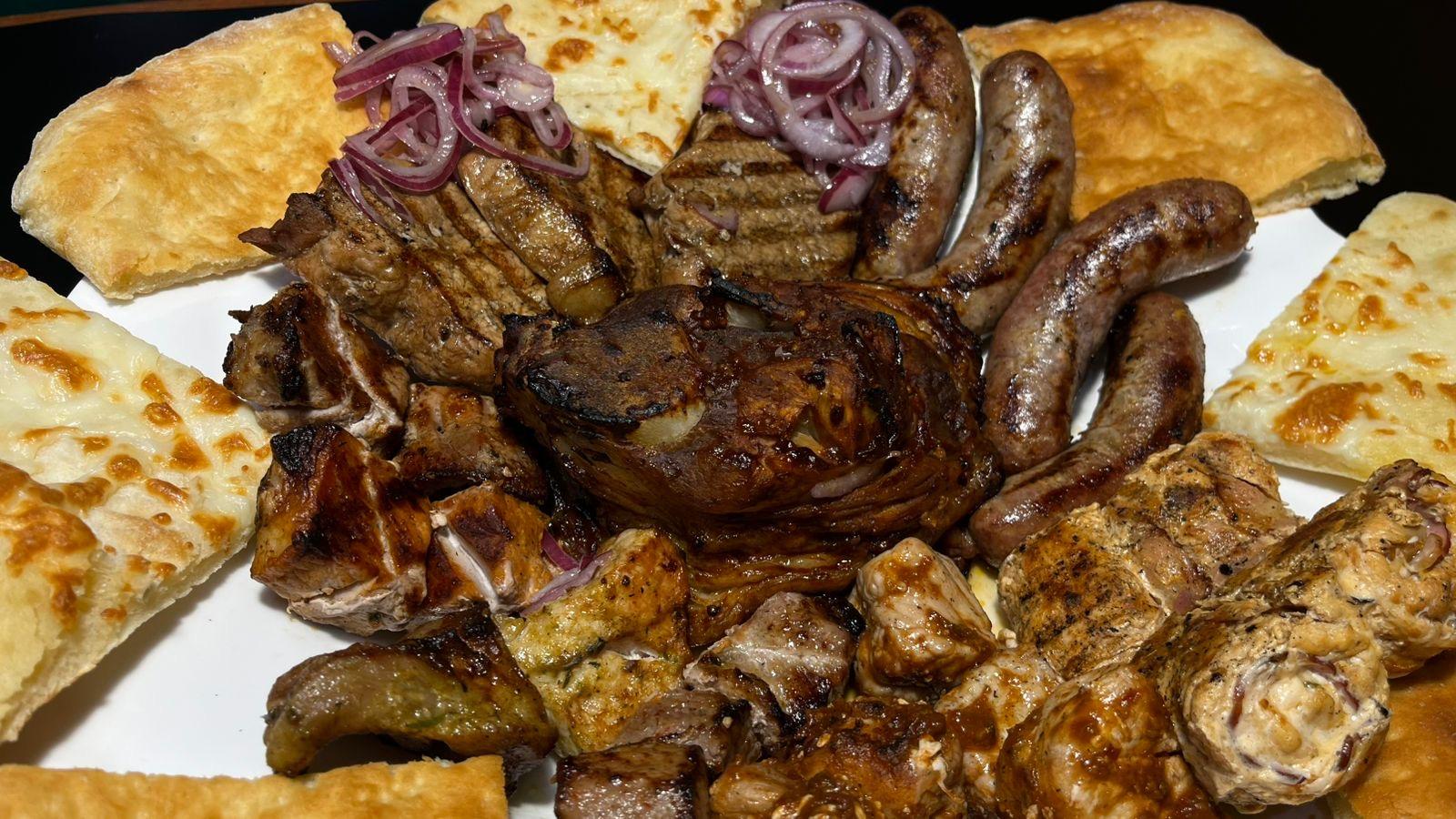 Шашлык в брусничном маринаде с чабрецом - 2шт, шашлык по Кавказски - 2шт, шашлык на гранатовом маринаде - 2шт, осетинский пирог с мясом - 1шт, хачапури по-Аджарски - 1шт, лепешка чесночная - 2шт, кавказские фаршированные томаты - 2 порции, рулетики Бадриджани - 1 порция, картофель по-Адыгейски - 2 порции, шампиньоны на мангале - 1 порция, соусы - Табаджан, Дзадзыки, Сацебели, Барбекю, кетчуп.