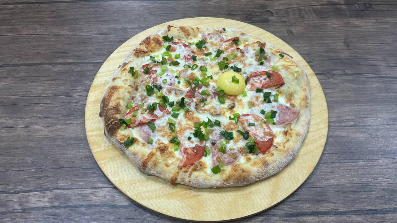 Моцарелла, ветчина куриная, бекон, томаты, сыр Пармезан, лук зеленый, желток, соус.