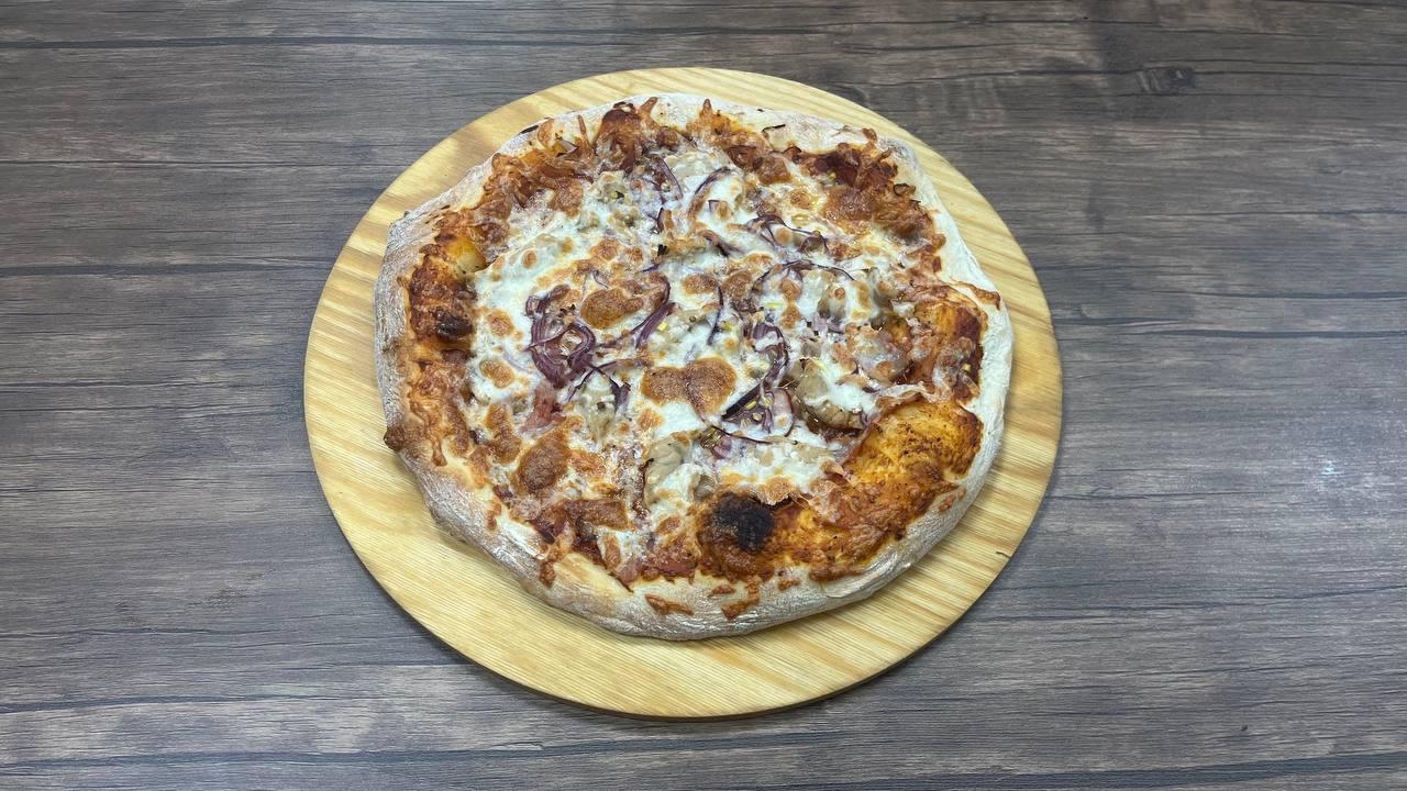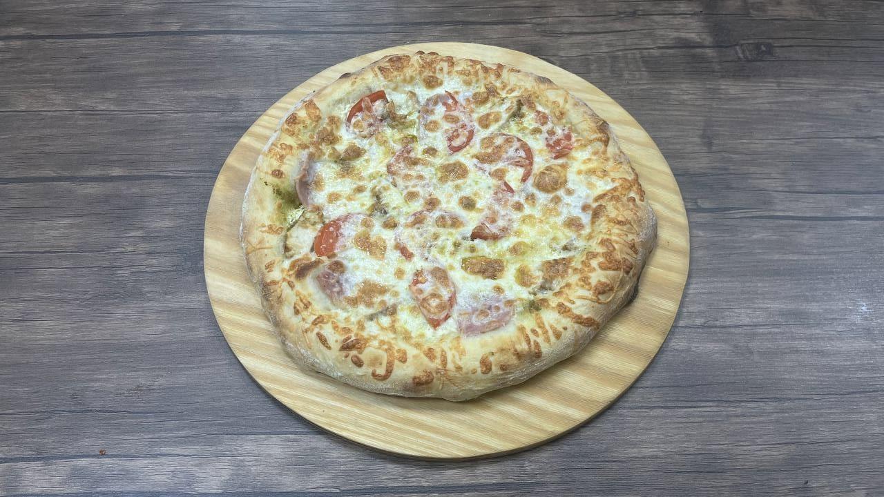Сыр Сулугуни, сыр Моцарелла, буженина, бекон, помидоры, соус.
