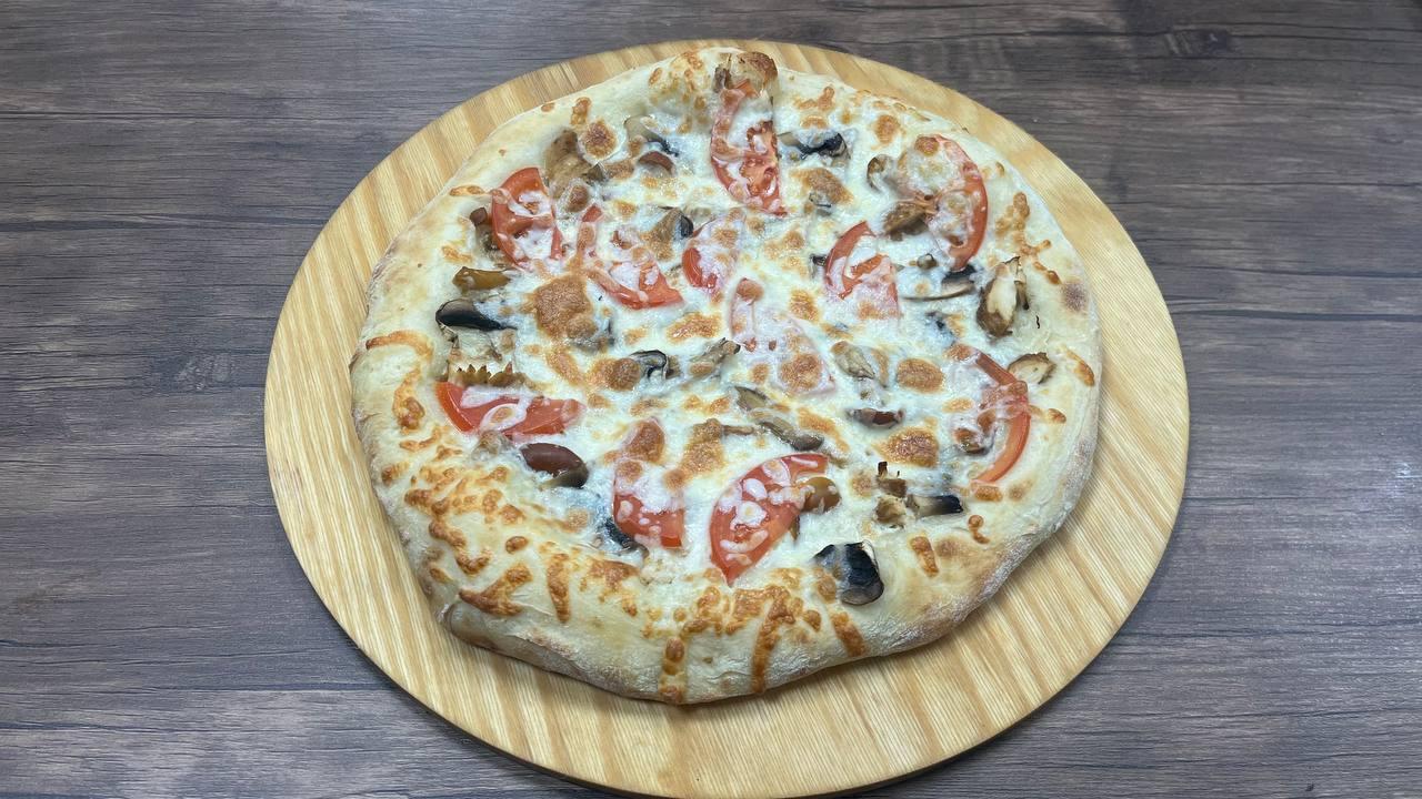 Курица, шампиньоны, томаты, опята, моцарелла, зелень, соус.
